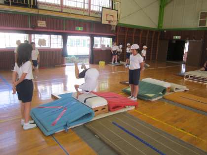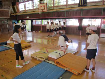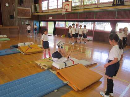 4年体育科「器械運動・跳び箱運動」 台上前転に取り組んでいました。技のポイントにを意識して台上前転をして、友達に評価してもらったり、アドバイスしてもらったり、進んで運動していました。