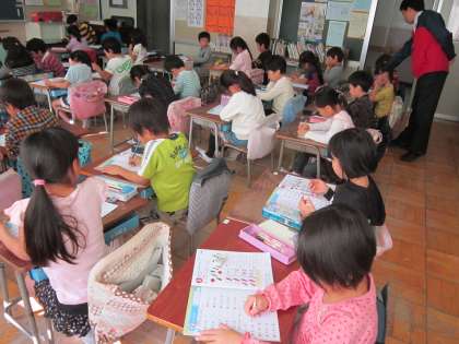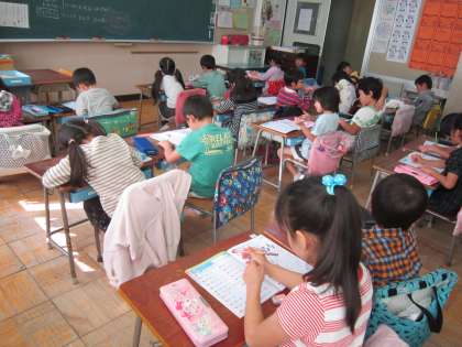 1年算数科「たし算」 たし算の習熟のための繰り返し練習に取り組んでいました。集中して、丁寧に確実にをめあてに学習していました。