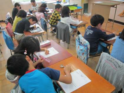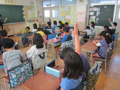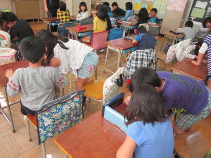 2年生活科「生きものとなかよくなろう」 ザリガニの赤ちゃんが生まれました。虫眼鏡で観察して、たくさんの気づきを話し合っていました。