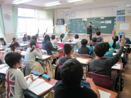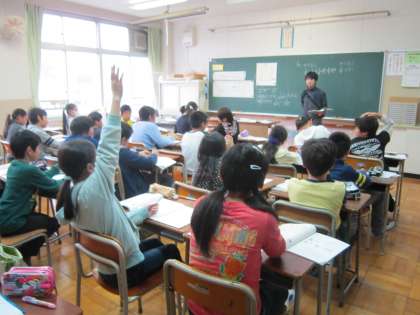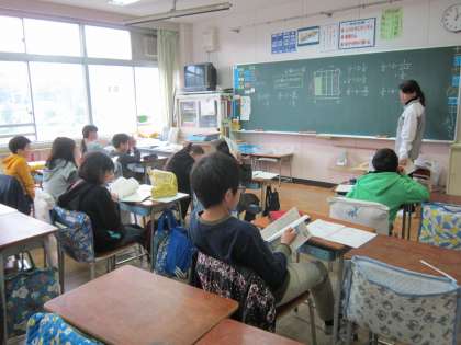 5年算数科「分数のわり算」 2学級3展開習熟度別の授業です。分数のわり算の計算の仕方を、面積図や計算のきまりを使って考え、話し合いっていました。