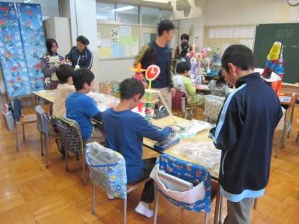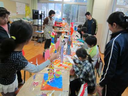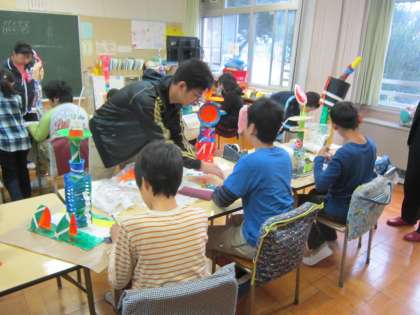 ひまわり学級図画工作科「マイタワー」 展覧会に向けて、最後の仕上げです。細かい作業に集中していました。
