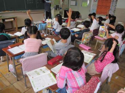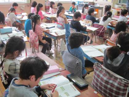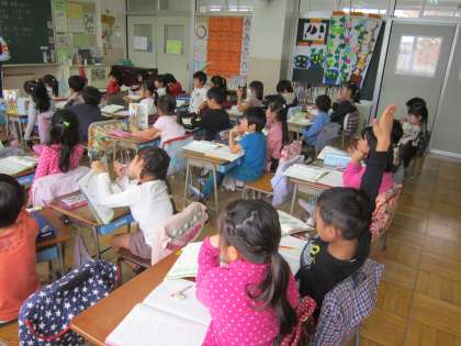 1年算数科「たし算(2)」 発展問題に挑戦です。7+4になるお話を探します。お話をよく聞いて、どんな計算になるか。よく考えながら学習していました。