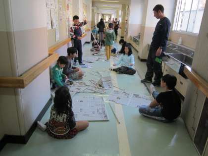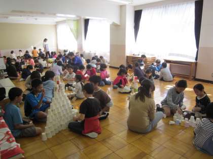 展覧会児童鑑賞日ですが、5時間目に全校児童がたてわり班で、造形遊びを楽しみました。