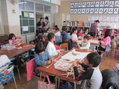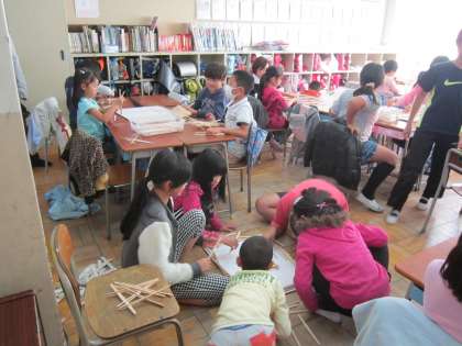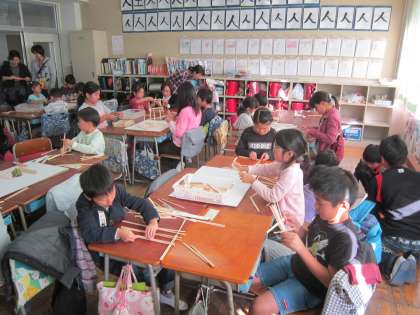 展覧会児童鑑賞日ですが、5時間目に全校児童がたてわり班で、造形遊びを楽しみました。