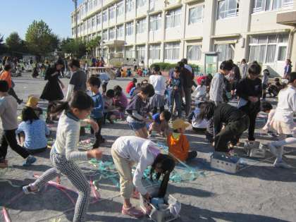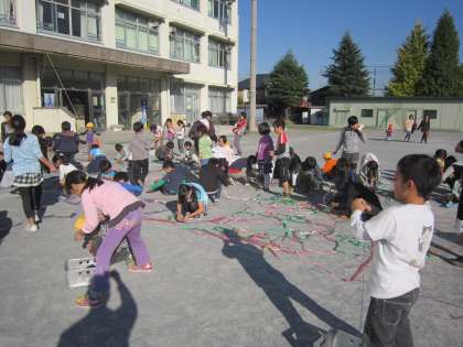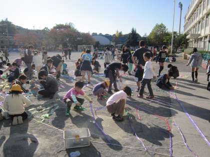 展覧会児童鑑賞日ですが、5時間目に全校児童がたてわり班で、造形遊びを楽しみました。