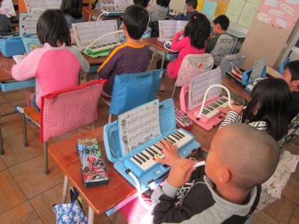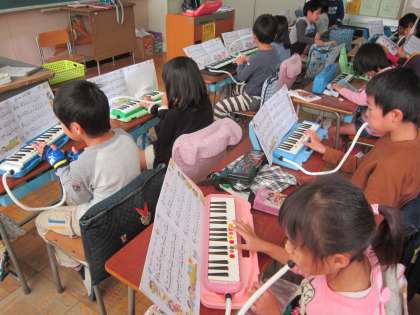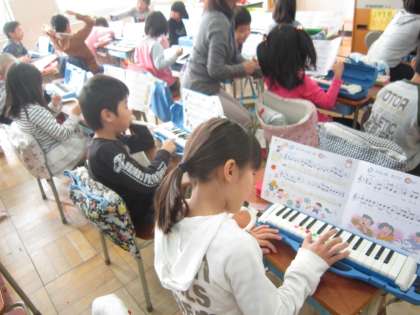 2年音楽科「おどろう たのしい ポーレチケ」「タンブリンのわ」 一人一人鍵盤ハーモニカを一生懸命に練習して、先生に演奏を確認しててもらいました。