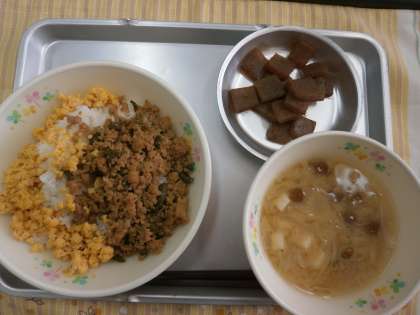 ※ 子供たちの好きないり卵ととりそぼろをごはんにのせた