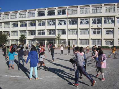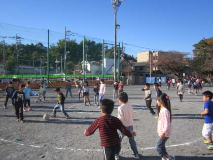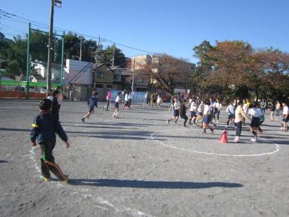 今朝は、児童集会で「ドーナッツ型ドッジボール」を全校で行いました。