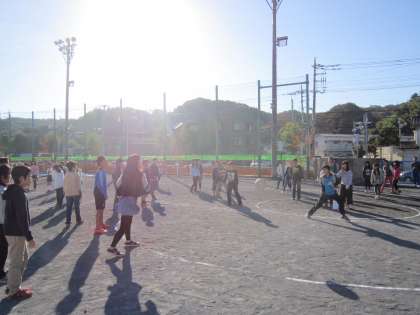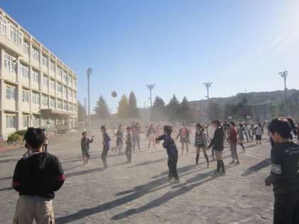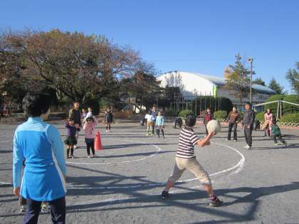 今朝は、児童集会で「ドーナッツ型ドッジボール」を全校で行いました。
