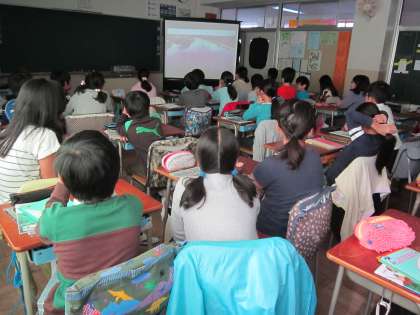 5年理科「流れる水のはたらき」 川の上流と下流のVTRをみて、川幅、水の流れ、石の様子について、比較しながら話し合っていました。