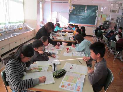 5年家庭科「おいしいね毎日の食事」 学習したことを活かして、家庭での調理計画を立てていました。味噌汁やおかずを一人一人考えていました。