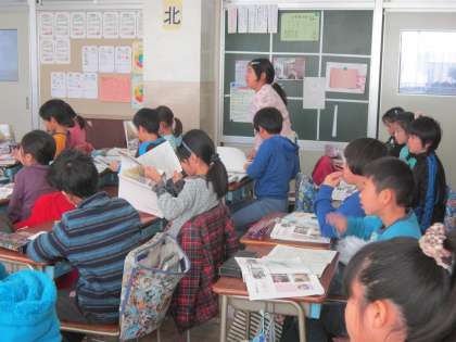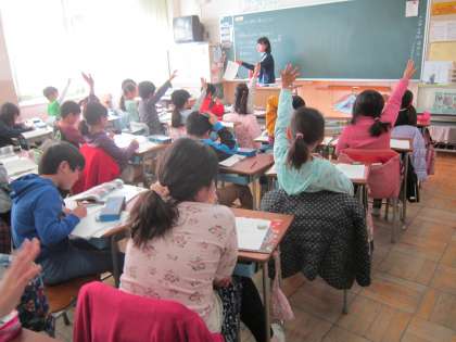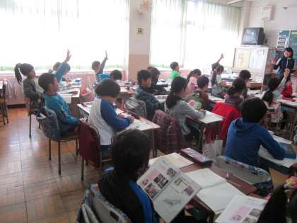 3年社会科「工場の仕事」 八王子の織物工場について、1学期の見学を振り返り、資料を見ながら学習していました。