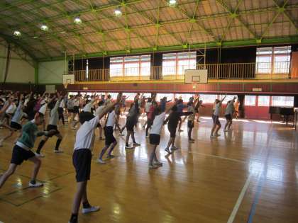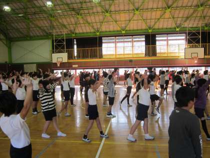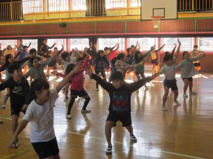 TV番組の振り付けもしているプロのダンス指導の先生に、全校の児童がダンスの指導を受けました。低学年、中学年、高学年に分かれて行いましたが、子供たちは寒さを吹き飛ばす勢いで、楽しく踊っていました。