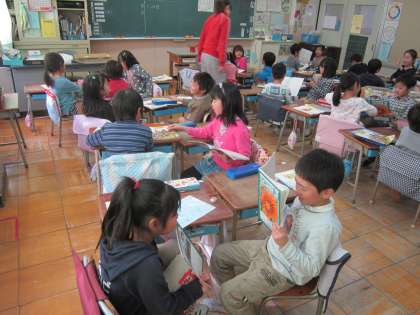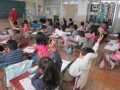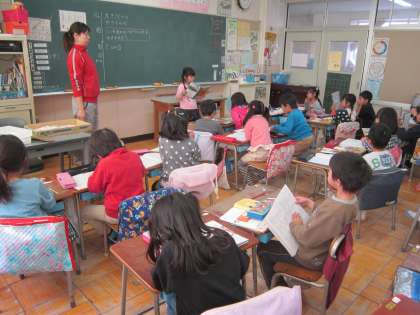 1年算数科「かさくらべ」 水のかさという言葉を学習して、2つのいろ水はどちらが多いか考えました。比べ方を二人で、そしてクラス全体で話し合いました。