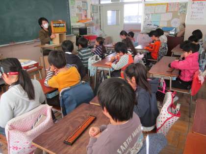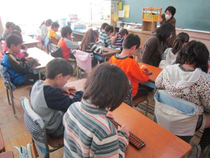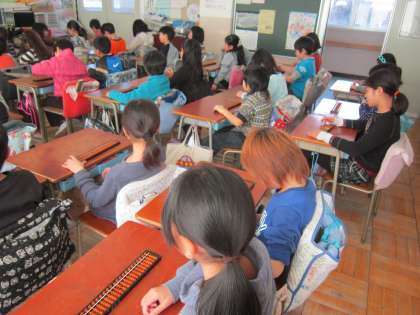 3年算数科「そろばん」 地域の方をゲストティーチャーに招いて、そろばんの基礎を指導していただきました。今日は、たし算を学習していました。