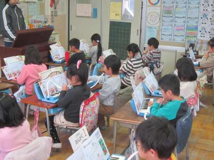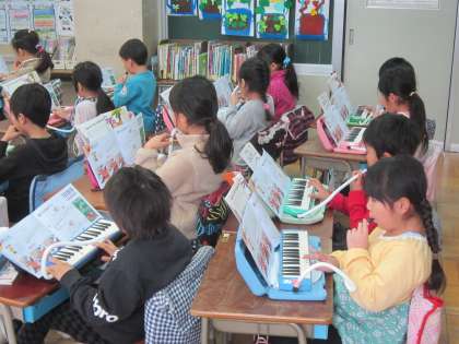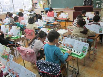 1年音楽科「あいあい・かえるの合唱」 動作を入れて歌ったり、指使いに気を付けて演奏したり、楽しそうに学習していました。