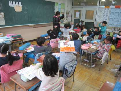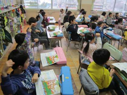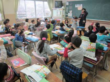 1年音楽科「あいあい・かえるの合唱」 動作を入れて歌ったり、指使いに気を付けて演奏したり、楽しそうに学習していました。