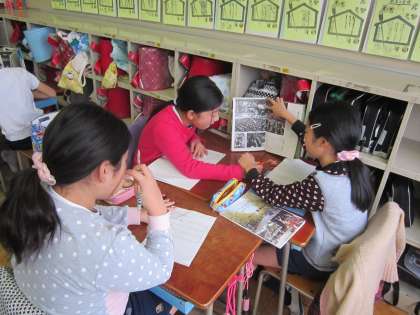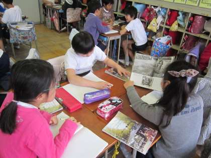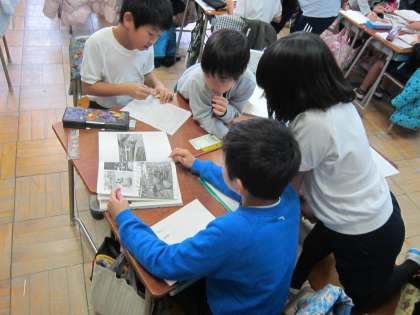 3年社会科「昔の生活を調べよう」 戦前・戦中、昭和20年代、30年代、40年代の人々の服装や道具について、資料を見ながら学習していました。