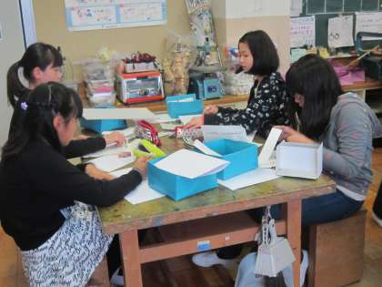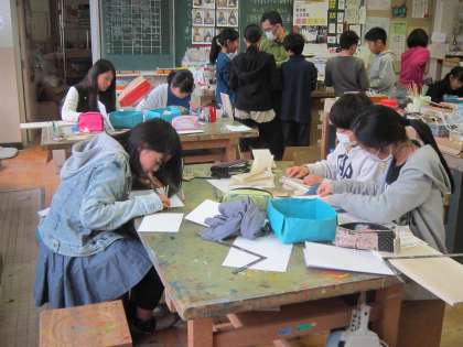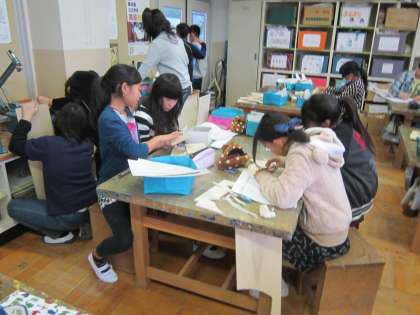 6年図画工作科「一枚の板から」 設計図、試作、板に製図、板を切る、仮組み、釘で組み立てるの順番で製作していきます。小学校生活最後の工作に、一生懸命取り組んでいました。