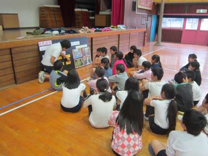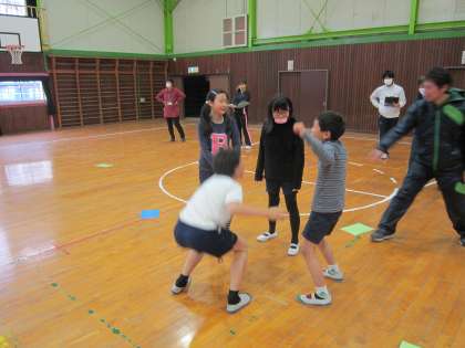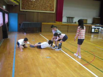 4年体育科・表現運動「ジャングル探検」 子供たちは、ジャングルに探検に出かけます。「わあ大変だ!」いろいろなことが起きるストーリーで心を解放させながら、運動していました。