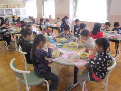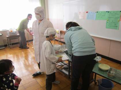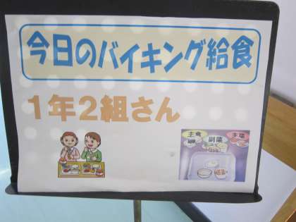 1年2組はバイキング給食でした。主食、主菜、副菜を上手に選んで、美味しくいただきました。
