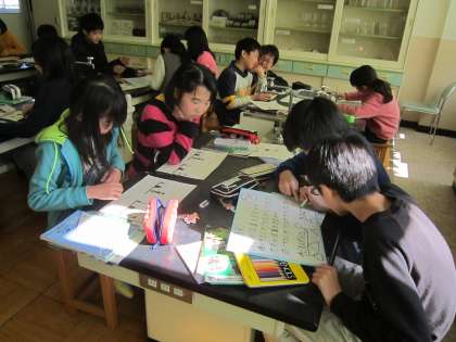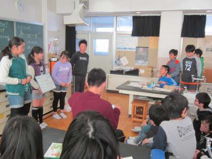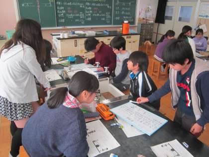 6年理科「てこのはたらき」 ものを小さな力で持ち上げるにはどうしたらよいか?予想を立てて、力点や作用点の位置の条件をを変えて実験しました。結果と考察をホワイトボードにまとめ、他のグループと情報交換していました。