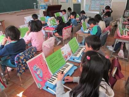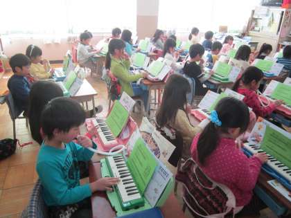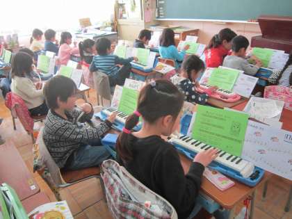 1年音楽科「ドレミの歌」「ようかいたいそう 第一」 指使いの練習をして、新しい曲に挑戦です。一生懸命に練習していました。