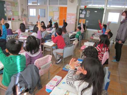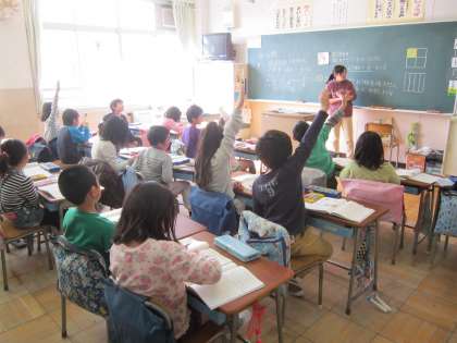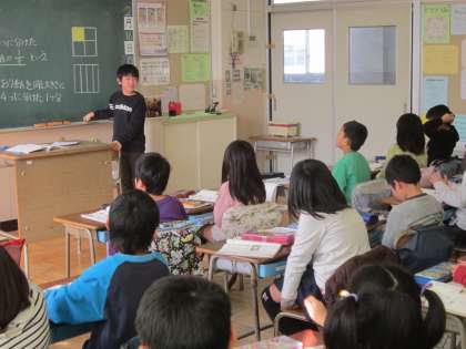 2年算数科「分数」 折り紙や図を使って、4つに分けた1つ分(4分の1)について学習していました。
