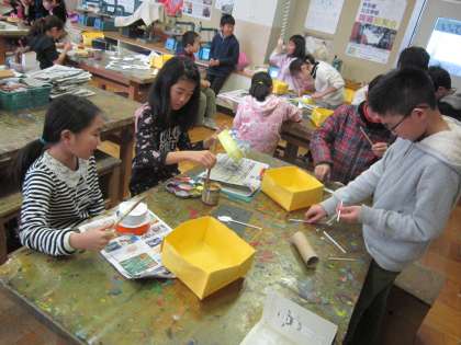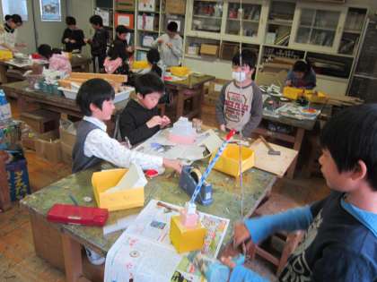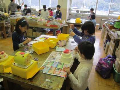 4年図画工作科「2分の1成人式ケーキ」 まず箱を作って、装飾してオリジナルのケーキができあがってきました。最後は、色にバニラエッセンスを入れて、においまでつけます。