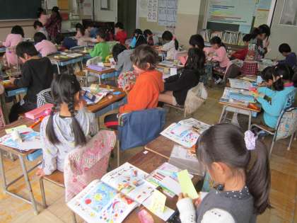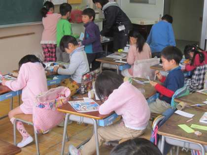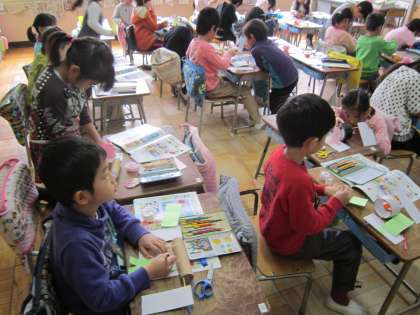1年図画工作科「おさんぽトコトコ」 竹ひご、ストロー、筒、色画用紙などを使って、ころころ転がる楽しい工作を楽しんでいました。