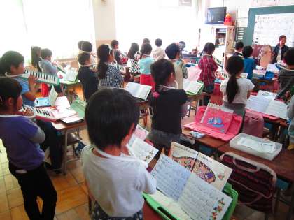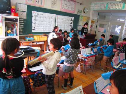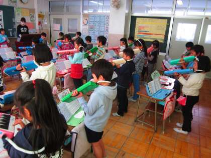 1年音楽科「こいぬのマーチ」 すず、大太鼓、タンバリンも入れての合奏がとても上手になりました。