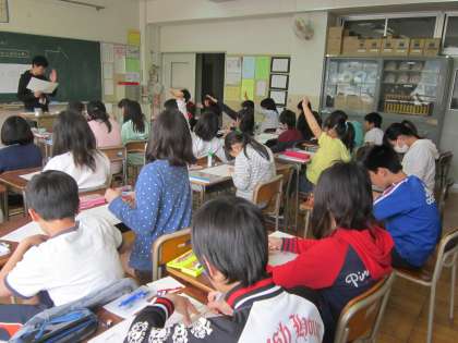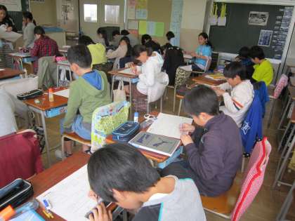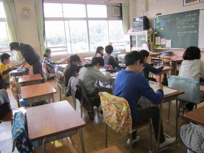 6年算数科「対称な図形」 2学級3展開習熟度別の授業です。点対称について学習し、対象の中心を見つけたり、点対称な点を見つけたり、よく考えながら学習していました。