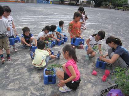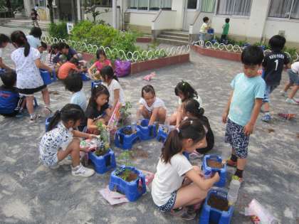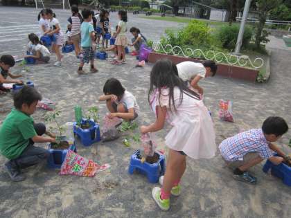 2年生活科「おひさまもりもり まるかじり」 ミニトマトの苗を植えました。一人一鉢で育てていきます。