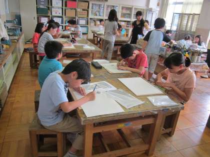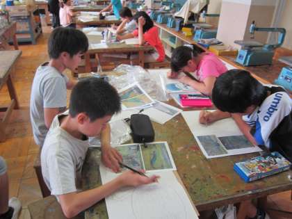 6年図画工作科「版画 孔雀」 木版画の学習です。孔雀の下絵を描いて、カーボン紙で木版にうつしとります。丁寧に下絵を描いていました。