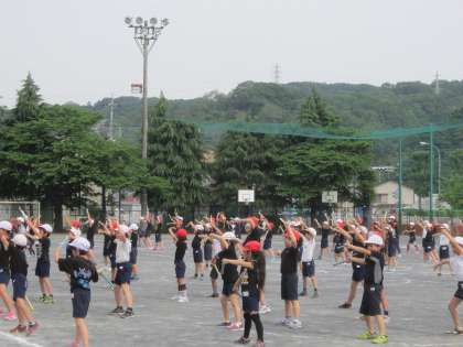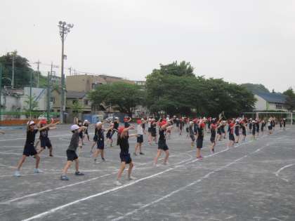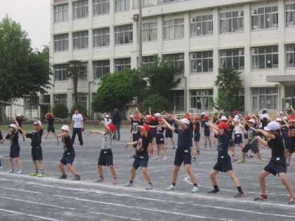 3・4年運動会の練習「ロック音頭 八木節」 体育館練習から校庭の練習になりました。一生懸命リズムに合わせて表現しています。