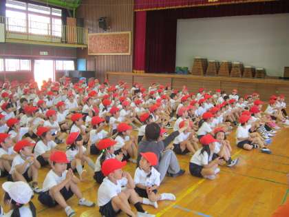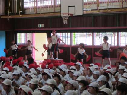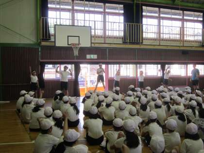 朝に時間に運動会の応援の集会がありました。今年の応援の仕方の説明があり、大きな声で応援合戦をしていました。