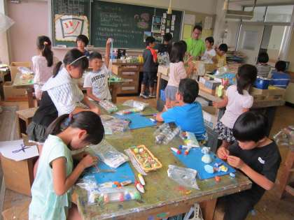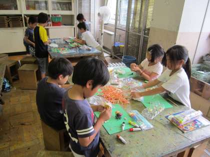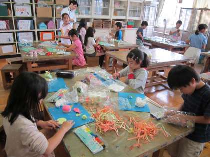 3年図画工作科「カラフルたまご」 紙粘土にニューカラーを混ぜてカラフルなたまごを作ります。たまごから生まれてきた不思議な生き物も作って、たまごパックでに寝床を作ります。楽しく工夫しながら取り組んでいました。