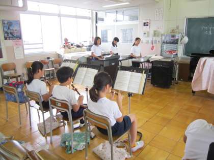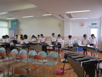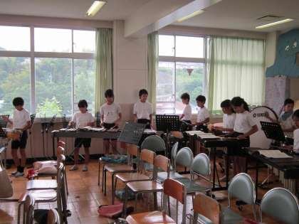 5年音楽科「ゴジラ」 ゴジラのメインテーマを曲のテンポに合わせて、いろいろな楽器で演奏していました。