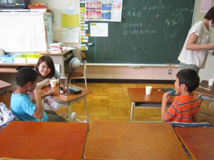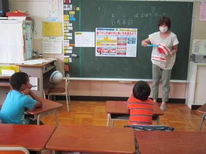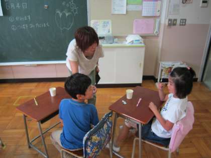 ひまわり学級学級活動「虫歯予防」 歯磨きの仕方を学習し、薬をつけて自分の歯の汚れ具合を調べました。鏡で見たり、友達と見合ったりしました。