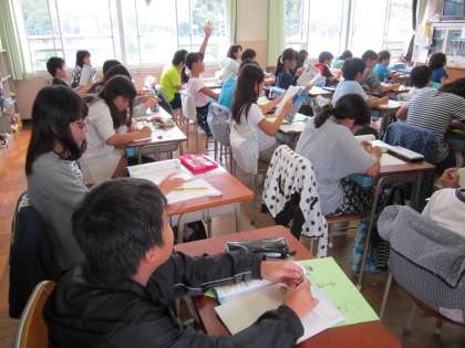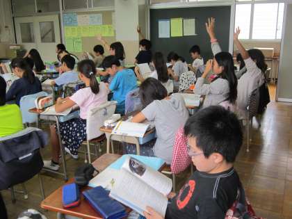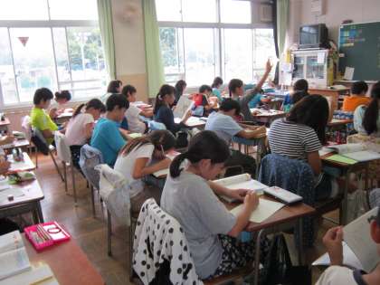 6年道徳「おみやげ」 公共心がテーマの授業です。旅先の景勝地で策が壊れているのをツアー客みんなで力を合わせてなおす話について、話し合いながら学習していました。