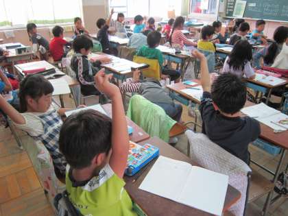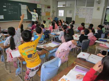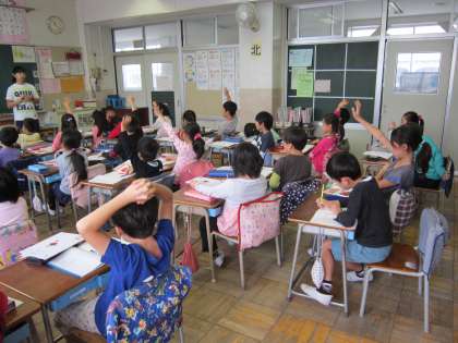 2年算数科「計算のくふう」 7+12+8の計算の答えを、かっこを使って簡単に、求めます。アイデアを出し合って、話し合いながら学習していました。
