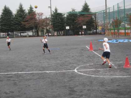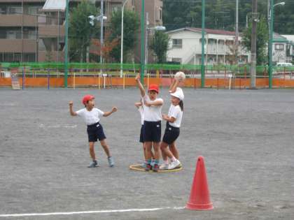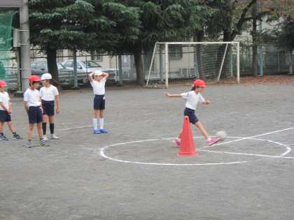 3年体育科「キックベースボール」 攻撃は、蹴って走って、守備は、走って捕って投げて、チームで協力して楽しみながら運動していました。