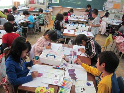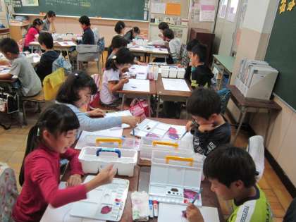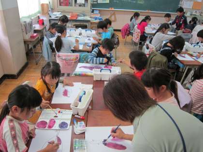 2年生活科「さつまいも」 たくさん収穫できたサツマイモを描きました。サツマイモの色を作って、点点で細かく色を付けました。