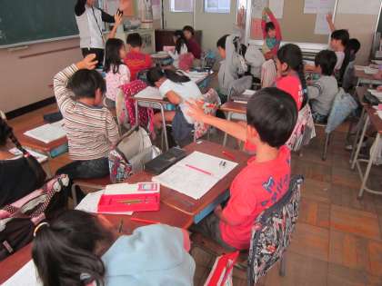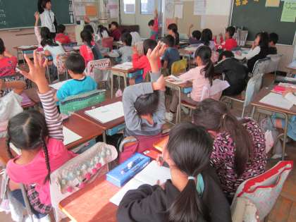 2年算数科「たし算とひき算のひっ算」 二ケタのたし算のひっ算の仕方を考え、話し合っていました。