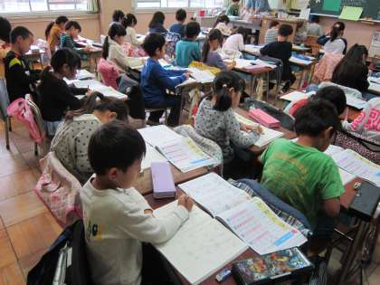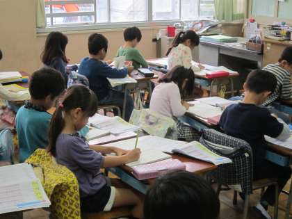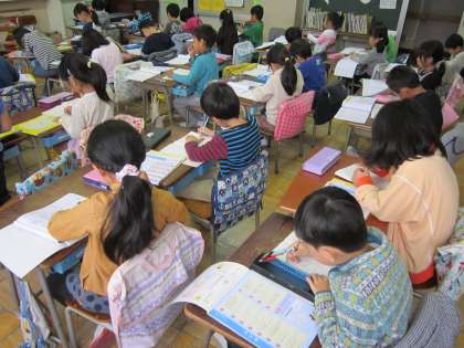1年国語科 書き順、止め、はらいに気を付けて、新出漢字の練習をしていました。