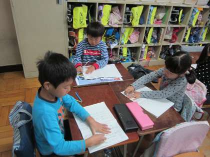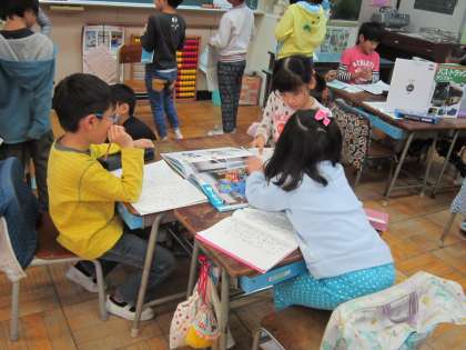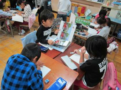 1年国語科「じどう車くらべ」 説明文を読んで、自分の好きな種類の自動車を絵本から見つけて、その自動車の紹介文を作りました。