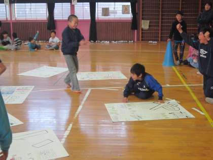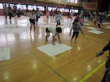 たてわり班で給食を食べて、お昼休みを一緒に過ごしました。2組のたてわり班は、体育館でジャンボカルタ大会をしました。