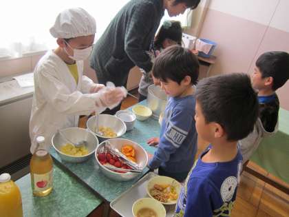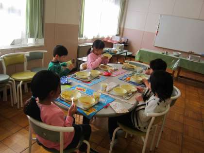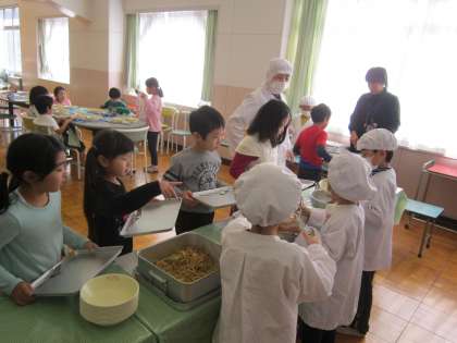 今日は、1年1組のバイキング給食でした。主菜副菜の量や種類を選んで、バランスよく美味しくいただきました。