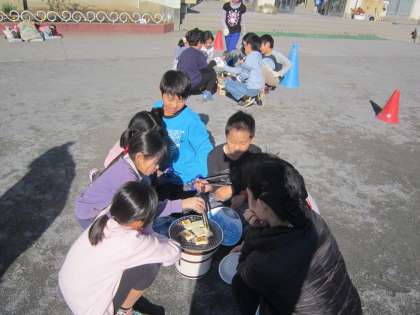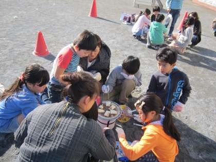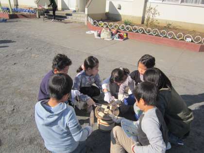 3年社会科「古い道具と昔のくらし」 今日は、昔の道具、七輪を使ってお餅を焼いて食べました。お餅があっという間に膨らんで、美味しくいただきました。