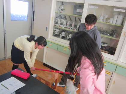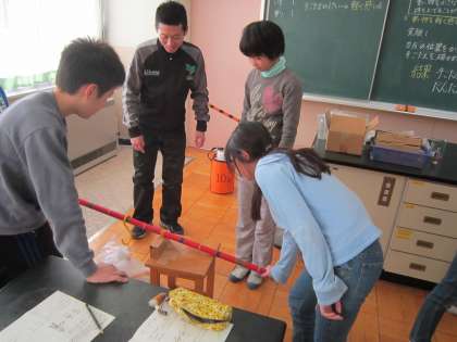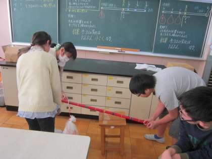 6年理科「てこのはたらき」 てこを使うと重い物を持ち上げることができるだろうか?支点、作用点、力点を変えて、実際にてこを使って物を持ち上げました。